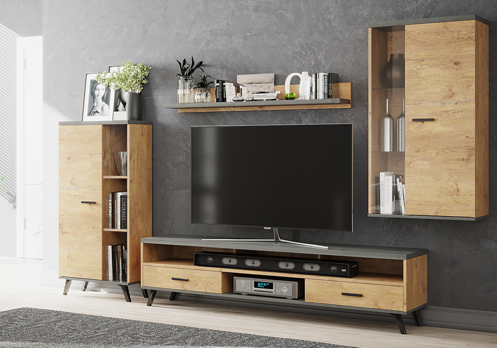 Regał i witryna, wchodzące w skład zestawu, pomogą ukryć przedmioty codziennego użytku lub wyeksponować je na otwartych półkach, natomiast szafka RTV bez problemu udźwignie telewizor, ponieważ zastosowano w niej gruby blat 28 mm odporny na ugięcia.