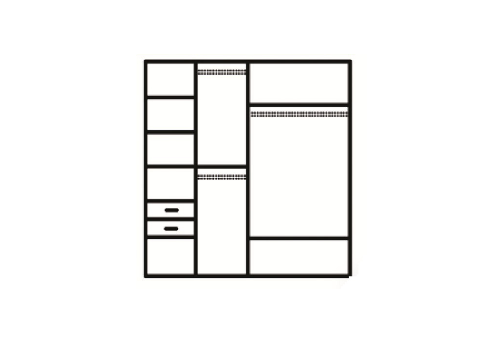 - w szafie 6 półek, 3 drążki na wieszaki oraz 2 szuflady