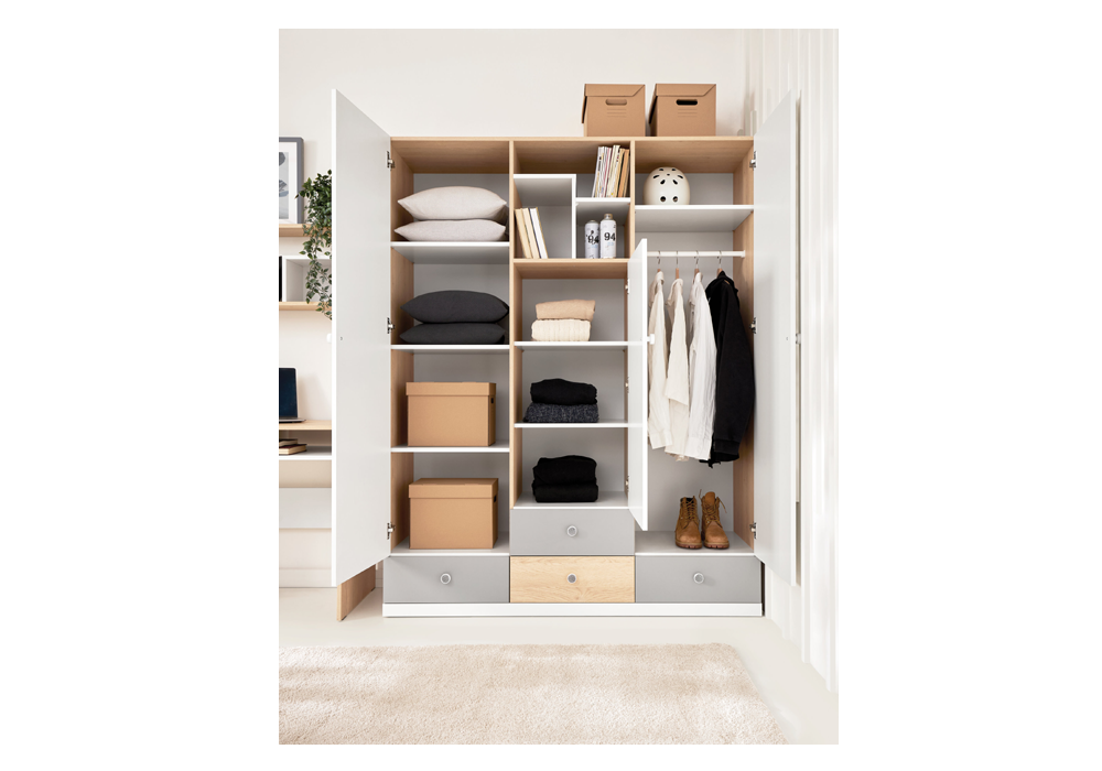 - w szafie półki, drążek na wieszaki oraz szuflady